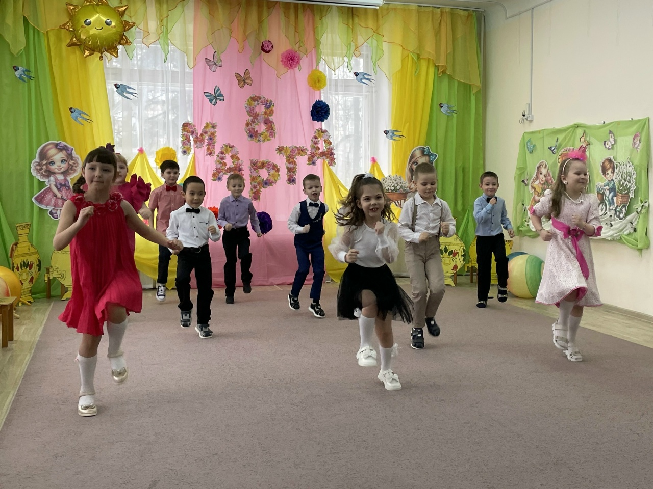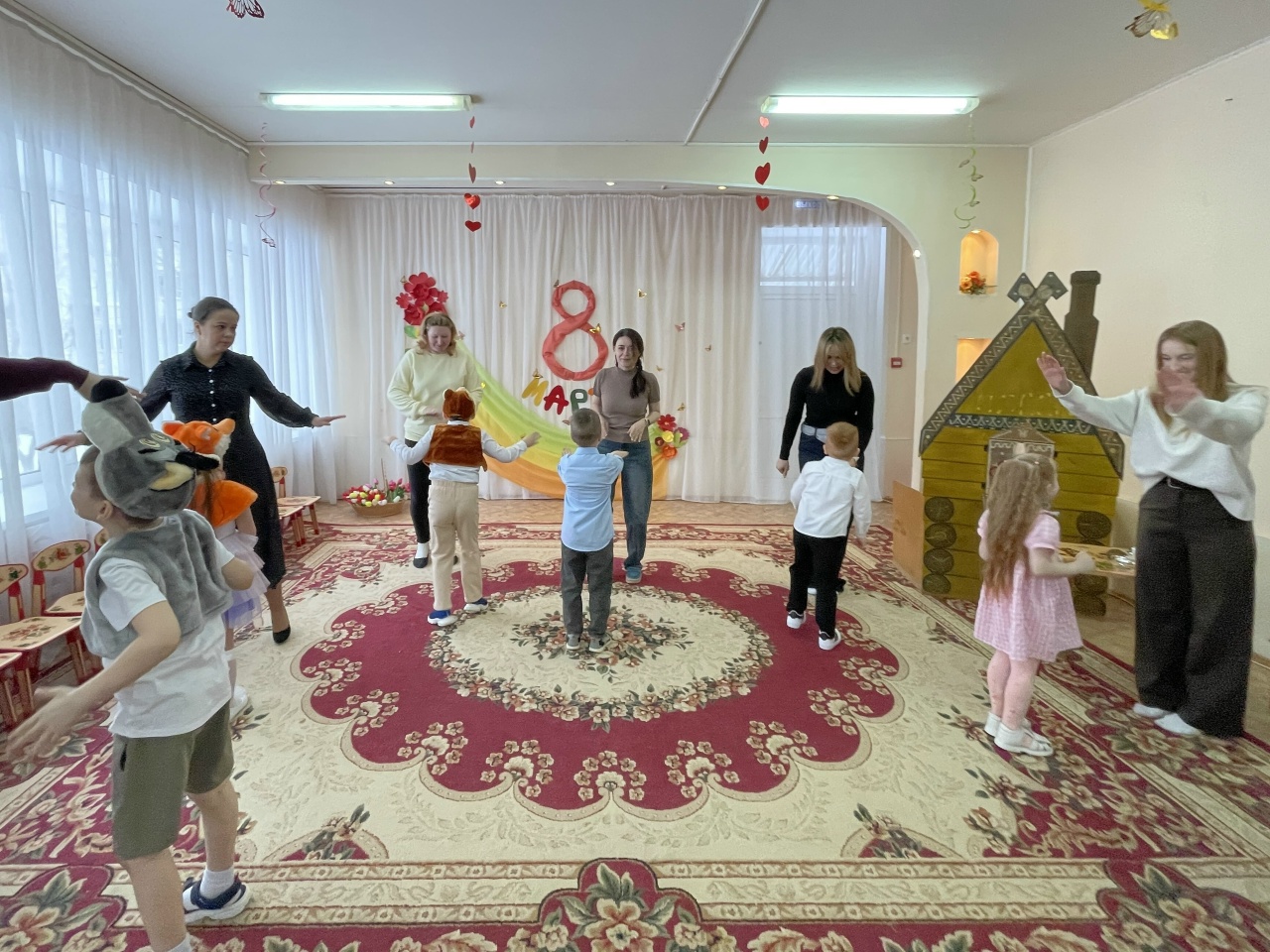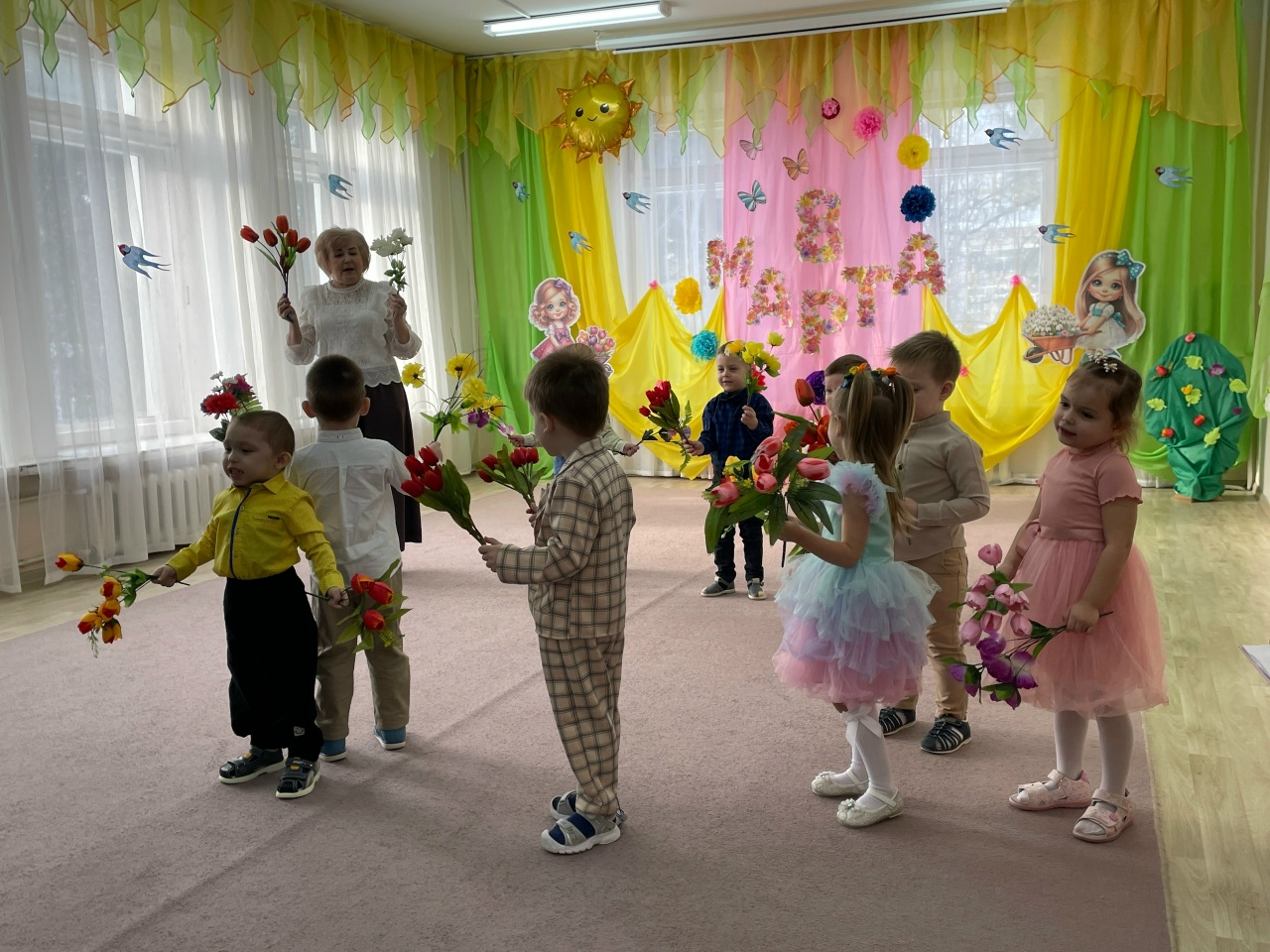 Яркие танцы с "цветными горошинами" и весенними цветами сменялись трогательными песнями о любимых мамах и бабушках. А игры с мамами добавили празднику атмосферу семейного тепла.